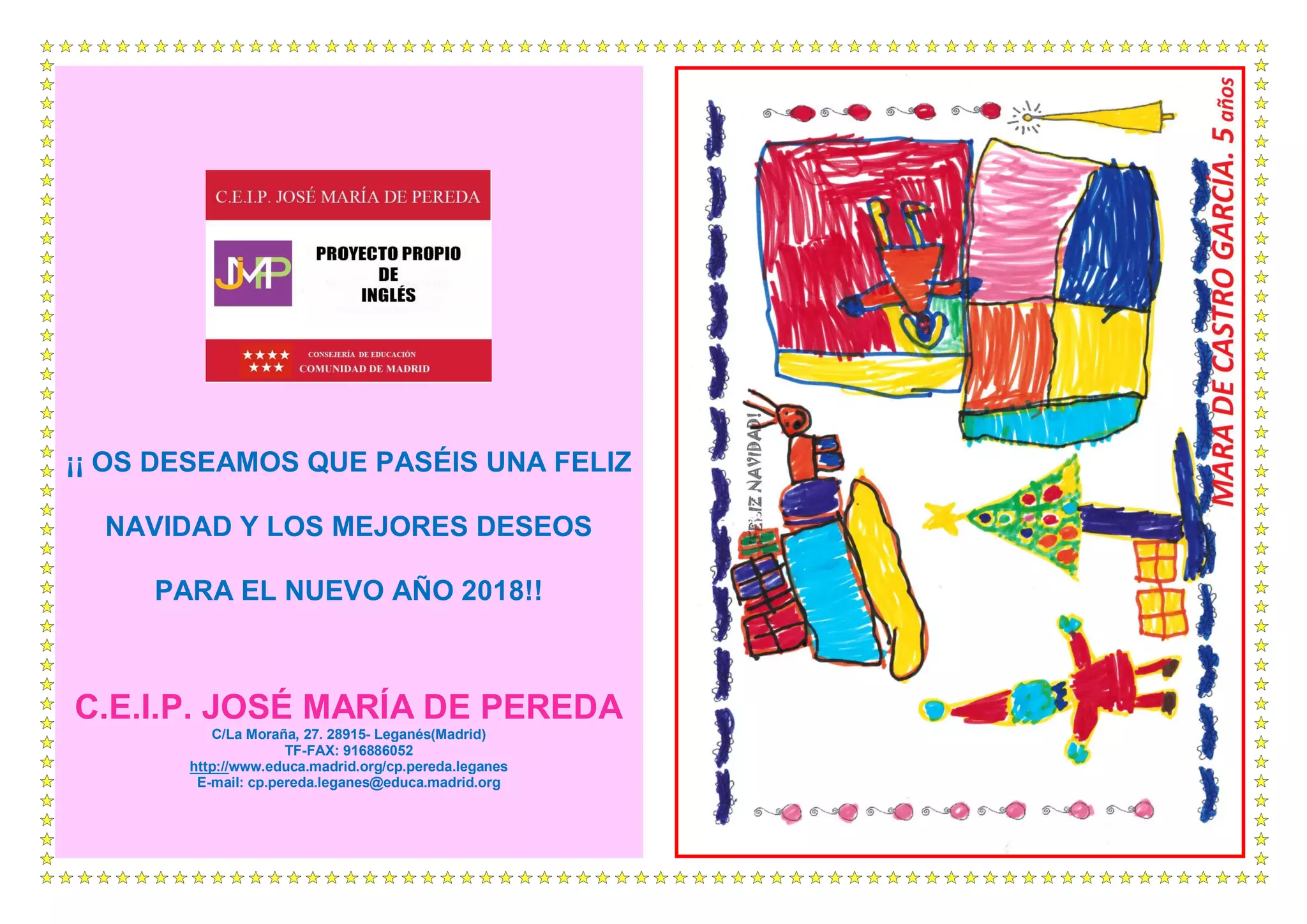 Este documento presenta el calendario de actividades navideñas de un colegio para la última semana antes de las vacaciones de Navidad. Incluye una chocolatada el lunes, una visita de los Reyes Magos el martes, festivales navideños para diferentes cursos el miércoles y jueves, y una fiesta de fin de trimestre el viernes antes de las vacaciones. También menciona otras decoraciones y concursos navideños organizados por el colegio y la asociación de padres.