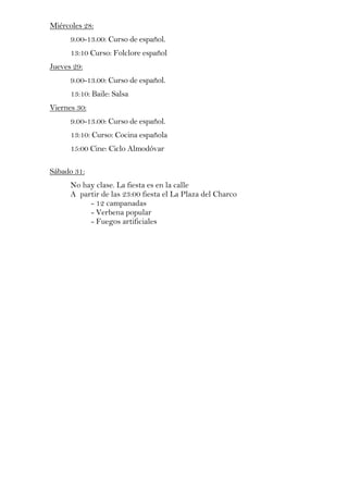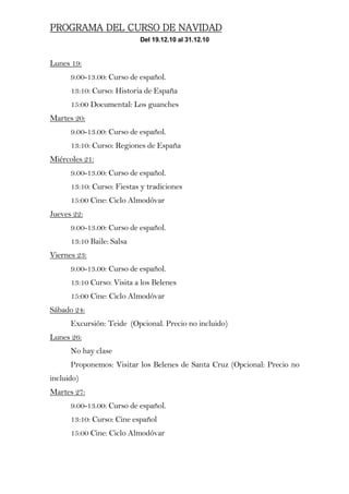 El documento presenta el programa de un curso de español que se llevará a cabo en Navidad del 19 al 31 de diciembre. Cada día incluye clases de español de 9 a 13 horas, seguidas de cursos o actividades sobre temas como la historia, regiones, fiestas y tradiciones de España, así como películas, baile y excursiones. El programa concluye el 31 de diciembre con una fiesta en la calle que incluye campanadas, verbena popular y fuegos artificiales.