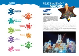 El documento describe varios eventos y espectáculos navideños que tendrán lugar en Madrid del 23 de diciembre al 8 de enero. Incluye proyecciones en 3D en la Plaza de Cibeles el 18 de diciembre, mercados navideños, artes escénicas como obras de teatro y conciertos para niños en la Ciudad de los Niños, y exposiciones en el Centro Cultural Conde Duque.