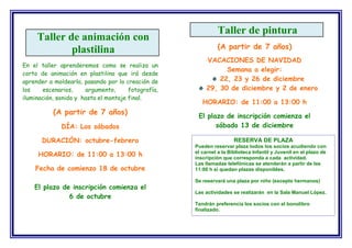 El documento anuncia varios talleres abiertos que se llevarán a cabo en la Biblioteca Provincial de A Coruña durante los meses de octubre y diciembre. Los talleres incluyen "Taller de reciclaje", "Día de la Biblioteca" y "Samaín" en octubre, y "Taller de Navidad" en diciembre. También se ofrecen talleres de animación con plastilina los sábados de octubre a febrero y talleres de pintura durante las vacaciones de Navidad.