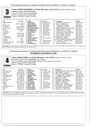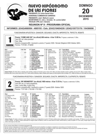 El documento detalla un programa de carreras de caballos, indicando distintos premios, pesos y requisitos para los participantes de cada carrera. Incluye información sobre las inscripciones, horarios de ingreso a veterinaria, y las apuestas disponibles. Se mencionan diversos caballos, jockeys y cuidadores, así como normas específicas para las competencias.