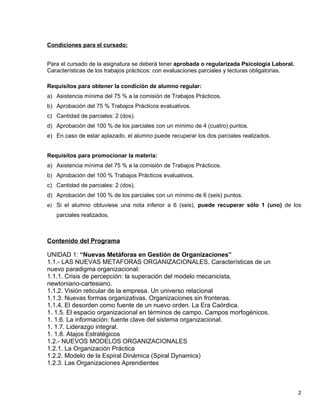 Este documento presenta el programa de la asignatura Psicología Organizacional de la Facultad de Psicología de la Universidad Nacional de Tucumán para el año 2009. El programa consta de 7 unidades temáticas que abarcan temas como nuevos modelos organizacionales, selección de personal, gestión del conocimiento, cambio organizacional, salud y trabajo, cultura organizacional y evaluación del desempeño. El documento también detalla los objetivos, características, requisitos y contenidos de la asignatura.