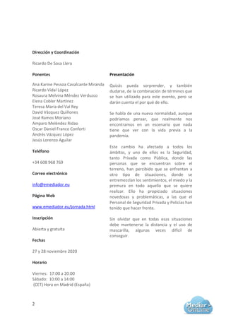 El documento aborda la transformación de la seguridad en un contexto de pandemia, enfocándose en la mediación como herramienta clave para la resolución de conflictos entre seguridad privada y pública. Se mencionan la importancia de la comunicación efectiva y la mediación informal, así como la adaptación de los protocolos de seguridad en un nuevo escenario social. Además, se presenta la agenda de jornadas académicas sobre el tema, donde expertos en mediación y seguridad discutirán estas problemáticas.