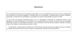 Este documento presenta el programa didáctico de un curso de planificación del proceso de enseñanza-aprendizaje en una universidad venezolana. El curso es teórico-práctico y obligatorio, y busca desarrollar competencias de planificación didáctica en los estudiantes. El programa incluye dos unidades sobre las bases teóricas y curriculares de la planificación, y sobre el proceso de programación de la enseñanza. Cada unidad contiene objetivos, contenidos, actividades y medios de evaluación.