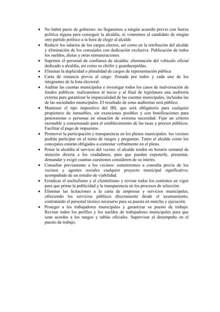 El programa propuesto por el secretario general del municipio busca erradicar la corrupción y el nepotismo mediante la gestión eficiente de los fondos públicos, fomentando la participación ciudadana y la transparencia. Se establecen compromisos ineludibles para mejorar la vida en el municipio, incluyendo la reducción de salarios de cargos electos y la auditoría de cuentas. Además, se plantean diferentes áreas de actuación para abordar cuestiones como la participación social, derechos sociales, dinamización económica y cultura, siempre promoviendo un enfoque colaborativo y sostenible.