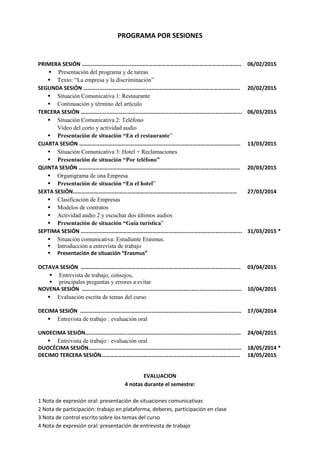 Este documento presenta un programa de 13 sesiones sobre situaciones comunicativas en contextos laborales. Cada sesión cubrirá un tema como presentaciones, artículos, vídeos y actividades sobre situaciones en un restaurante, por teléfono o en un hotel. También incluirá lecciones sobre la estructura de empresas, contratos y entrevistas de trabajo, con evaluaciones escritas y orales al final.