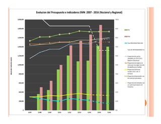 Este documento describe la evolución de la implementación del Presupuesto por Resultados (PpR) en el sector salud del Perú entre 2007 y 2015. El PpR busca mejorar la eficiencia y efectividad en la asignación de recursos presupuestales enfocándose en resultados en lugar de insumos. Se detallan los programas presupuestales implementados en salud y las leyes que fueron estableciendo el marco legal para el PpR durante este periodo.