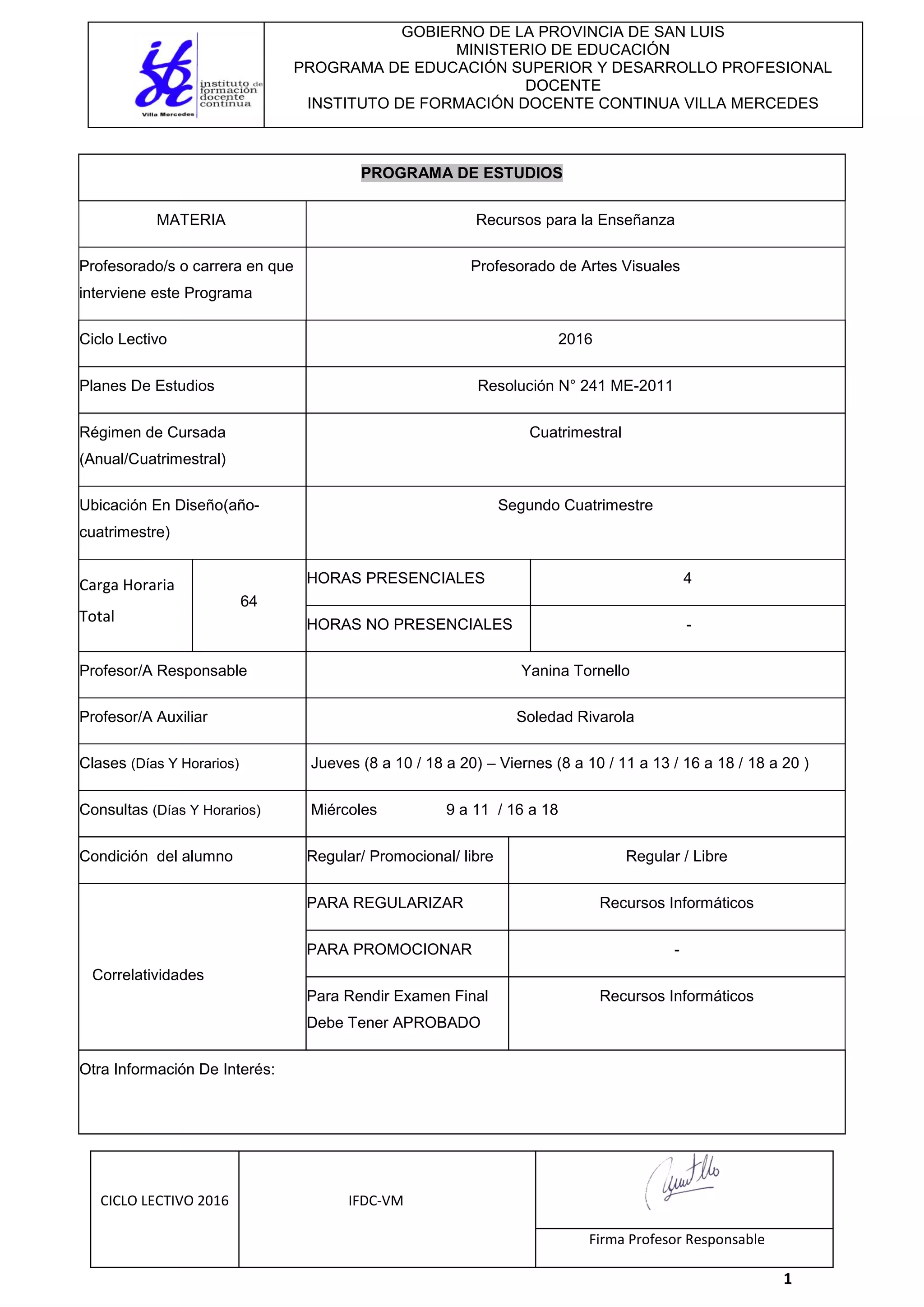 Este documento presenta el programa de estudio para la materia "Recursos para la Enseñanza" dictada en el Instituto de Formación Docente Continua Villa Mercedes durante el ciclo lectivo 2016. La materia es cuatrimestral y apunta a profesores del Profesorado de Artes Visuales. El programa describe los objetivos, contenidos, metodología y régimen de evaluación, con énfasis en enseñar a los estudiantes a seleccionar y utilizar diferentes recursos y herramientas didácticas como imágenes, gráficos, sonido y