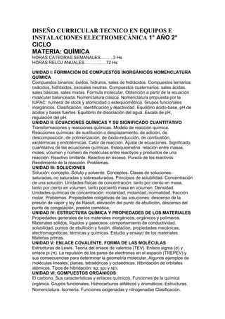 El documento detalla el diseño curricular para el primer año del ciclo técnico en electromecánica, enfocándose en la materia de química con seis unidades que abarcan formación de compuestos, ecuaciones químicas, soluciones, propiedades de materiales, enlace covalente y compuestos orgánicos. Se abordan conceptos esenciales como la nomenclatura química, equilibraciones, estequiometría, propiedades coligativas y estructuras moleculares. Además, se discuten los grupos funcionales en química orgánica y sus aplicaciones.
