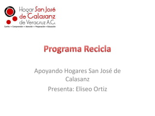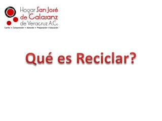 El documento presenta el programa Recicla que tiene como objetivo crear conciencia ecológica y apoyar al Hogar San José de Calasanz a través de la reducción, reutilización y reciclaje de materiales tanto en el hogar como en la escuela. El programa cuenta con un centro de acopio ubicado en Veracruz donde se reciben donaciones que apoyan a niños en situación de riesgo social.