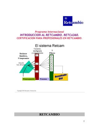 El documento detalla el programa de certificación 'Retcambio', diseñado para formar profesionales en un enfoque integral de cambio a través de siete módulos. Este modelo busca transformar realidades personales y organizacionales, ofreciendo estrategias desde hace más de 25 años en la academia y consultoría. Además, se mencionan las ventajas del programa, los costos involucrados y la posibilidad de certificar a participantes en diversas modalidades.