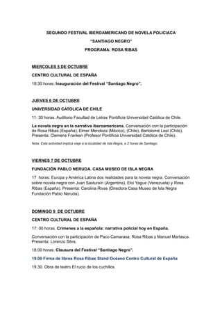 El segundo festival iberoamericano de novela policiaca 'Santiago Negro' se llevará a cabo del 5 al 9 de octubre en distintos lugares como el Centro Cultural de España y la Universidad Católica de Chile. El evento incluirá conferencias y conversaciones sobre la novela negra con autores destacados como Rosa Ribas, Elmer Mendoza y Juan Sasturaín. El festival concluirá con una firma de libros y una obra de teatro relacionada con el tema.