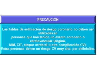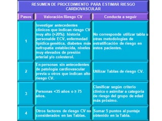 Este documento describe el Programa de Salud Cardiovascular de Chile. Las enfermedades cardiovasculares son la principal causa de muerte en el país. El programa se basa en evaluar el riesgo cardiovascular global de un individuo considerando múltiples factores de riesgo, en lugar de enfocarse solo en factores aislados. El objetivo es prevenir la morbilidad y mortalidad de personas en riesgo mediante la detección de factores de riesgo, el establecimiento de metas de tratamiento según el nivel de riesgo, y la confirmación del diagnó