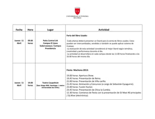 El documento presenta el programa de la Semana Mechona 2013 en Santiago, Chile. Contiene 3 actividades principales: 1) una acción solidaria el miércoles 10 de abril, 2) una feria del libro usado el jueves 11 de abril, y 3) la fiesta mechona principal el jueves 11 de abril en el Teatro Caupolicán desde las 19:00 horas con shows musicales, concursos y DJs.