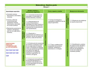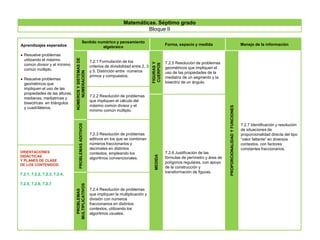 El documento describe los aprendizajes esperados en matemáticas para séptimo y octavo grado, incluyendo la conversión de números fraccionarios y decimales, resolución de problemas con ecuaciones y la construcción de figuras geométricas. Se abordan temas como el uso de fórmulas para calcular áreas y volúmenes, así como el análisis de datos mediante gráficas. Además, se proporcionan orientaciones didácticas y planes de clase para cada bloque de contenido.