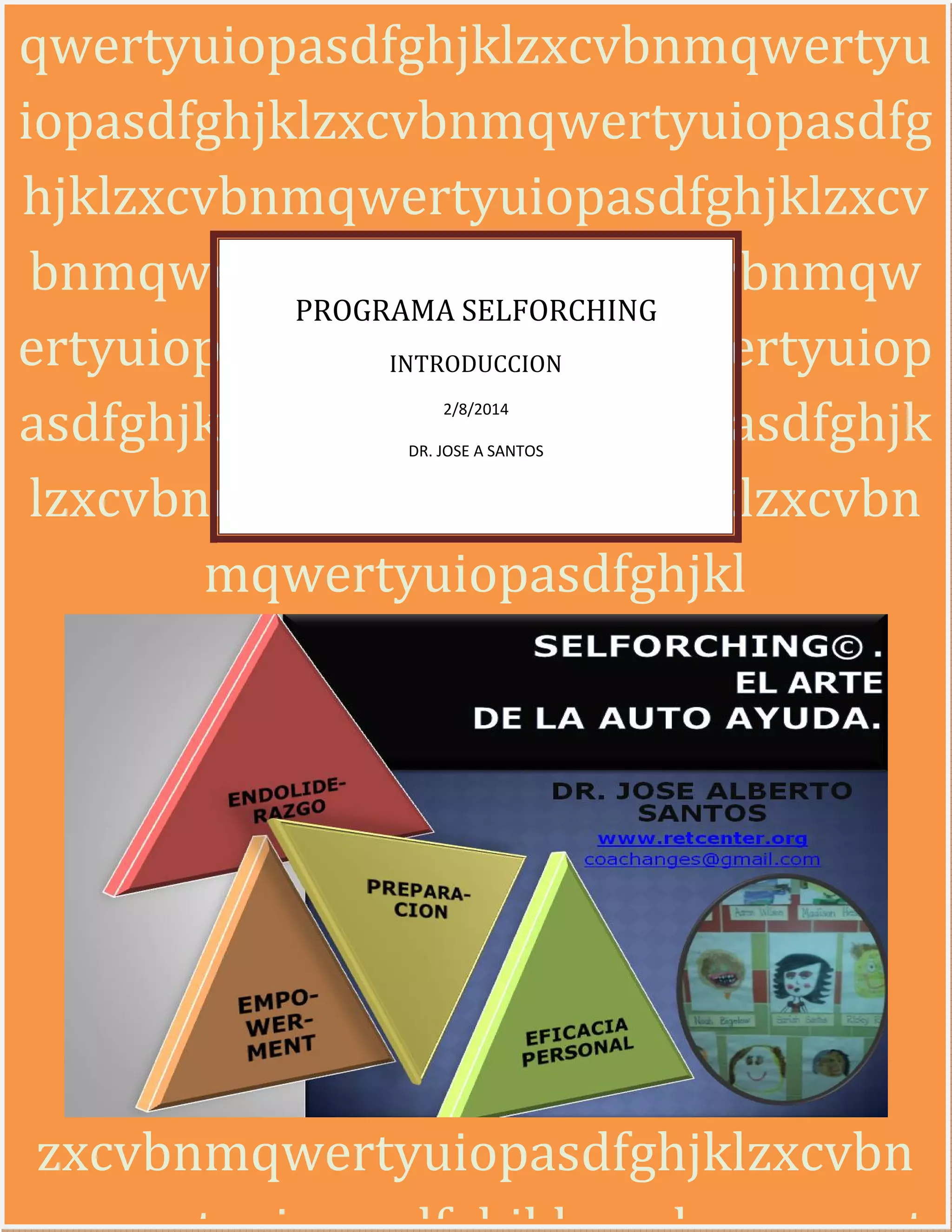 El documento presenta 'selforching©', un programa innovador diseñado para empoderar a los individuos mediante la mejora del liderazgo y eficacia personal, basado en la teoría de las 'obvias realidades'. A través de un enfoque en la preparación y la toma de decisiones, el programa busca ayudar a las personas a enfrentar desafíos y transformaciones en su vida. Se estructura en diferentes niveles de aprendizaje y está dirigido a una amplia audiencia, incluyendo profesionales y líderes comunitarios.