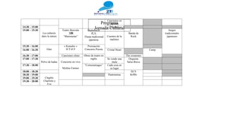 El documento presenta la agenda del día para un evento que tendrá lugar en el Migdal Bavel. La agenda incluye una variedad de actividades como inauguraciones, presentaciones musicales, obras de teatro, películas, bailes, exhibiciones de artes marciales, juegos y concursos en diferentes idiomas y culturas como francés, japonés, inglés y polinesio durante las 9 horas que durará el evento.