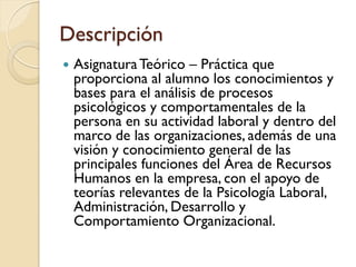 Este documento presenta la cátedra de Psicología Laboral y Organizacional del semestre de otoño de 2011. La asignatura analizará los procesos psicológicos y comportamientos de las personas en el ámbito laboral y organizacional desde una perspectiva teórica y práctica. El curso se centrará en temas como la cultura organizacional, el comportamiento organizacional, el liderazgo y las habilidades directivas. La metodología incluirá clases expositivas, trabajos de investigación, casos reales y evaluaciones periódic