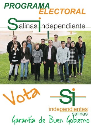El documento resume los logros del partido Salinas Independiente durante la legislatura pasada, incluyendo la gestión eficaz de la crisis, y presenta su programa para la próxima legislatura enfocado en continuar mejorando la administración pública, fomentar el empleo y apoyar los servicios para los ciudadanos.