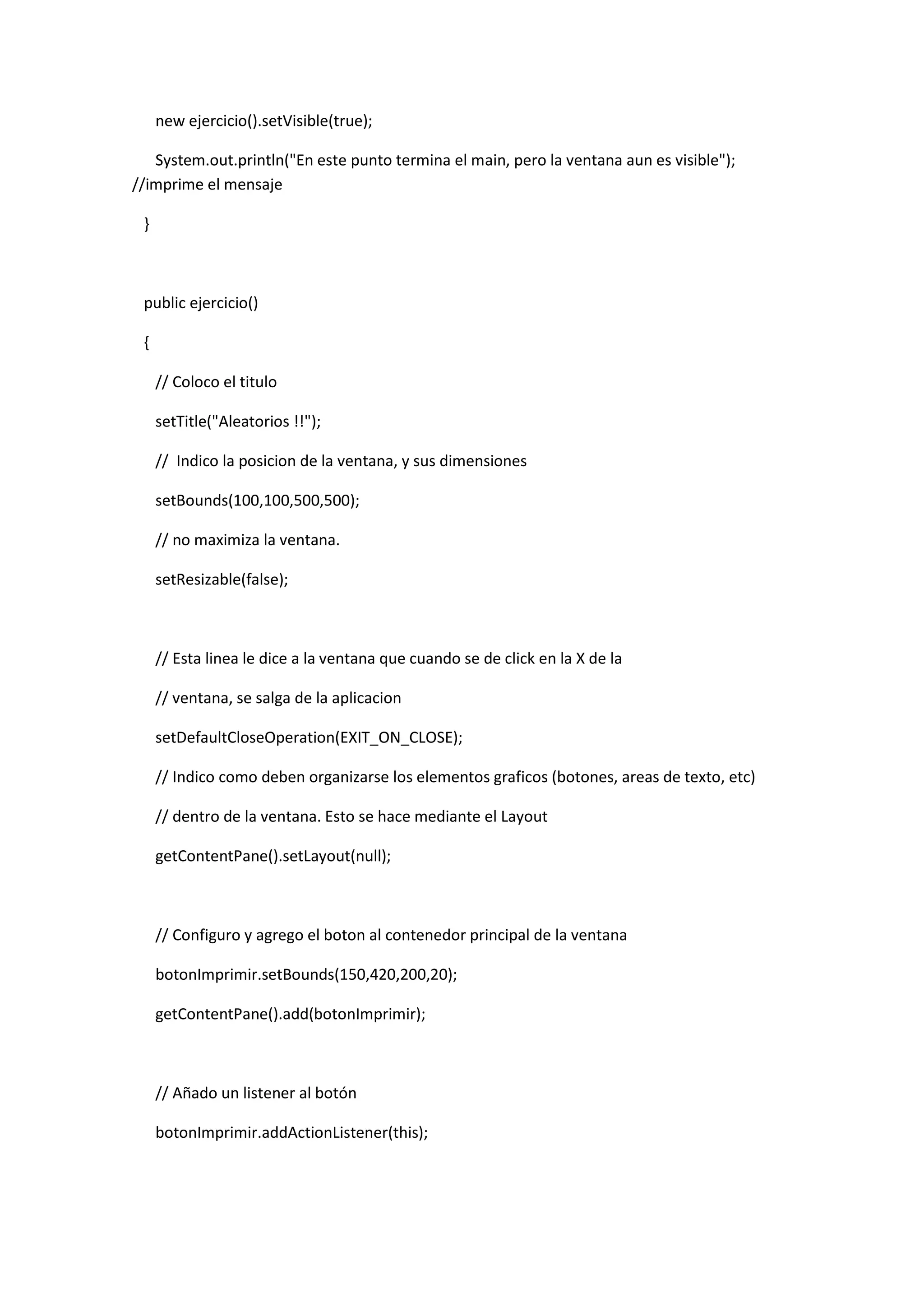 Este programa genera números aleatorios y los imprime en un área de texto en lugar de en la consola cuando se presiona un botón. Se crea un botón, un área de texto y un panel de desplazamiento para el área de texto. Al presionar el botón, se genera un número aleatorio y se agrega al área de texto con salto de línea. El programa establece el título de la ventana, su posición, tamaño y comportamiento de cierre, y agrega los componentes al contenedor principal.