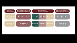 Este documento presenta un resumen del nuevo Plan y Programa de Estudios 2022 para la Educación Básica en México. Explica que se establecen fases en lugar de grados escolares para organizar los contenidos, lo que permite dedicar más tiempo a procesos de aprendizaje. También describe que los contenidos se relacionan entre campos formativos en lugar de disciplinas, abordando temas relevantes desde diferentes perspectivas. El objetivo es promover un enfoque integral del aprendizaje.