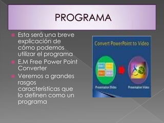 Este documento resume las características y funcionalidades del programa E.M. Free Power Point Converter, el cual permite convertir presentaciones de PowerPoint a formatos de video como AVI, MPG y WMV de forma rápida y sencilla. El programa es gratuito y ofrece la opción de convertir presentaciones a imágenes, video y audio con calidad, además de contar con características como conversión por lotes, recorte personalizable y compatibilidad con PowerPoint 2000/2002/2003/2007. El documento explica que para utilizar el programa basta con cargar las present