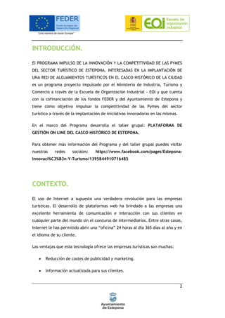 Este documento describe un taller grupal sobre la gestión de una plataforma en línea para alojamientos turísticos en el casco histórico de Estepona. El taller enseñará a las pymes turísticas cómo usar la plataforma para promover sus negocios, incluyendo cómo cargar información, fotos, ofertas y más. El objetivo es ayudar a las pymes a ser más competitivas e innovadoras a través del uso de las tecnologías de la información.