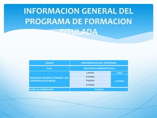 El documento proporciona información sobre un programa técnico de Asistencia Administrativa de 12 meses de duración que desarrolla competencias relacionadas con la producción de documentos, el apoyo a sistemas de información contable, el procesamiento de información y la organización de eventos, con el fin de que los estudiantes puedan desempeñarse como asistentes administrativos u ocupaciones similares.