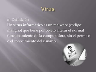 Este documento presenta información sobre los virus informáticos. Define un virus como un malware que altera el funcionamiento de la computadora sin el permiso del usuario. Luego enumera varias acciones dañinas que pueden realizar los virus, como borrar archivos, modificar sectores del disco duro, reemplazar el sector de arranque, y causar que el sistema funcione lento o se congele. Finalmente, explica que los virus se propagan a través de redes sociales, dispositivos USB, correos electrónicos y descargas, y pueden ser utilizados por empresas