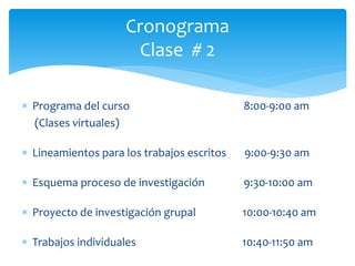 Este documento presenta el programa y los objetivos de la segunda clase del seminario de tesis doctoral en la Universidad Libre de Costa Rica. La clase cubrirá el proceso de diseño de investigación, los diseños utilizados en tesis, y lineamientos para la redacción de trabajos escritos. Los estudiantes trabajarán en grupos en un proyecto de investigación y redactarán preliminarmente tres capítulos de su tesis individual.