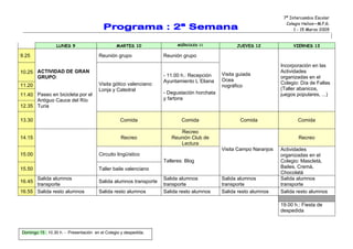 El documento presenta el programa de actividades de una semana de intercambio escolar entre el Colegio Helios de Valencia, España, y la escuela alemana M.P.G. del 1 al 15 de marzo de 2009. El programa incluye visitas turísticas de la ciudad, talleres culturales como fallas y cocina, actividades deportivas como paseos en bicicleta, y eventos especiales como una recepción en el ayuntamiento y una fiesta de despedida.