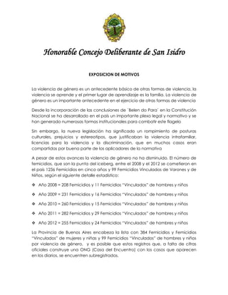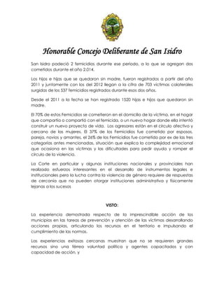 Este documento propone la creación de un Programa Municipal de Lucha contra la Violencia de Género en San Isidro. Presenta estadísticas sobre la violencia de género en el país y la provincia de Buenos Aires. Propone fortalecer la Dirección de la Mujer, capacitar agentes, implementar protocolos, y crear recursos como una cámara Gesell, un refugio para víctimas, equipos de apoyo psicológico y legal, y un sistema de alertas y monitoreo con botones de pánico. El objetivo general