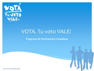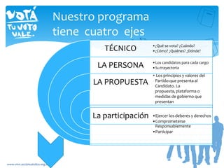 Este documento presenta un programa de participación ciudadana para promover la democracia y el voto en Argentina. El programa tiene cuatro ejes: técnico, la persona, la propuesta y la participación. Busca educar a los ciudadanos, especialmente a los jóvenes, sobre el proceso electoral, los candidatos y valores para que ejerzan su derecho al voto de manera responsable e informada.