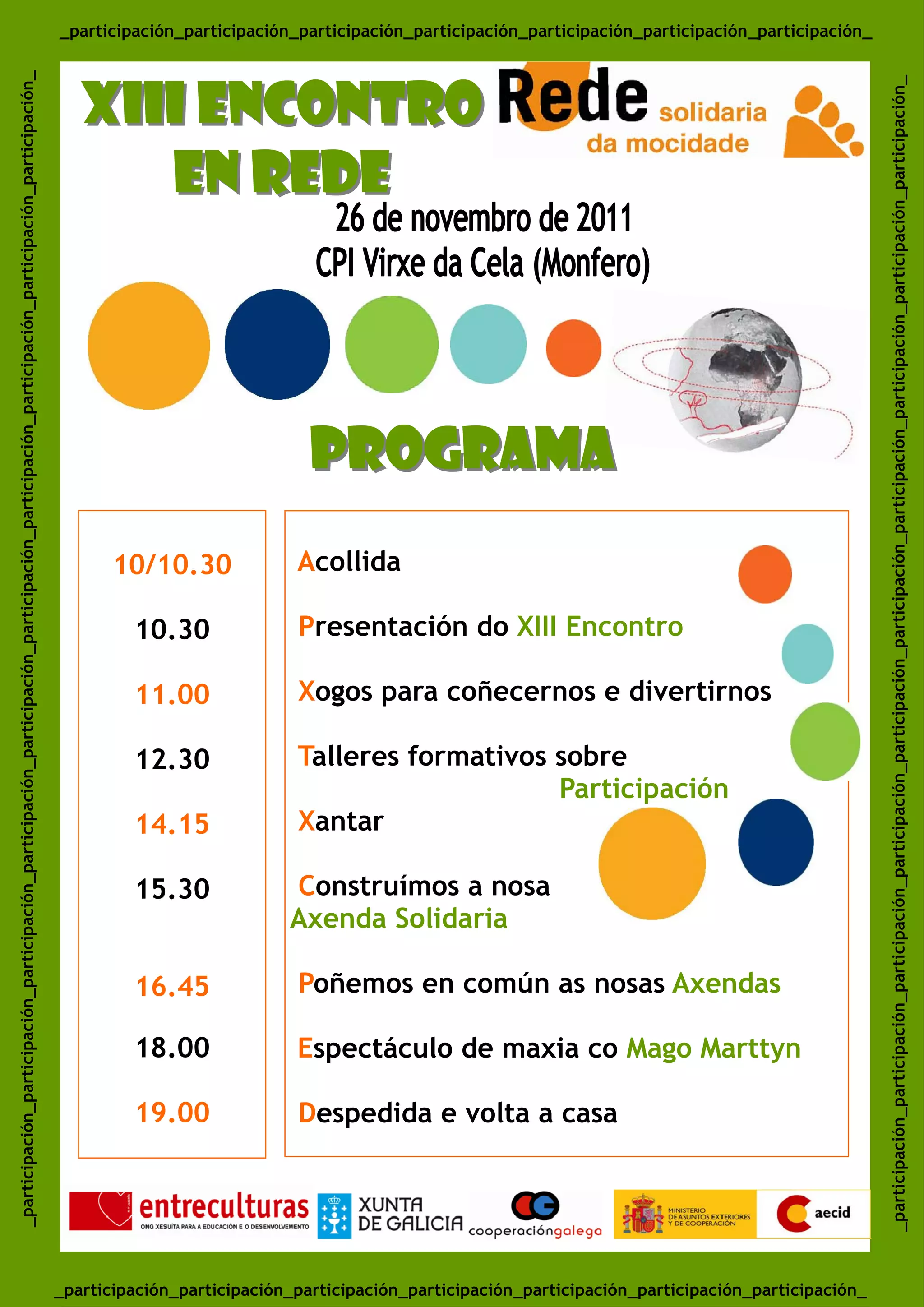 El documento presenta el programa para el XIII Encontro en Rede. La agenda incluye una sesión de bienvenida, presentación del evento, juegos para conocerse, talleres sobre participación, almuerzo, construcción de una agenda solidaria, compartir las agendas, un espectáculo de magia y despedida.