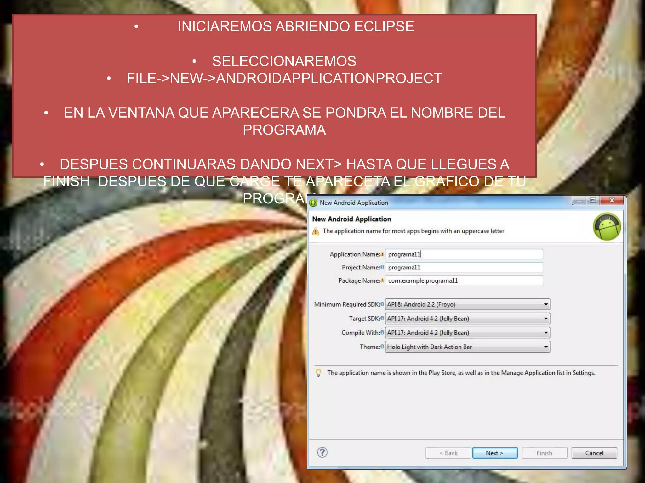 El documento describe los pasos para crear un proyecto de aplicación Android en Eclipse, incluyendo abrir Eclipse, seleccionar File > New > Android Application Project, darle un nombre al proyecto, y hacer clic en Finish para que cargue la interfaz gráfica del programa. También explica que Eclipse facilita la reutilización de código y recursos y la configuración y personalización del proceso de desarrollo.