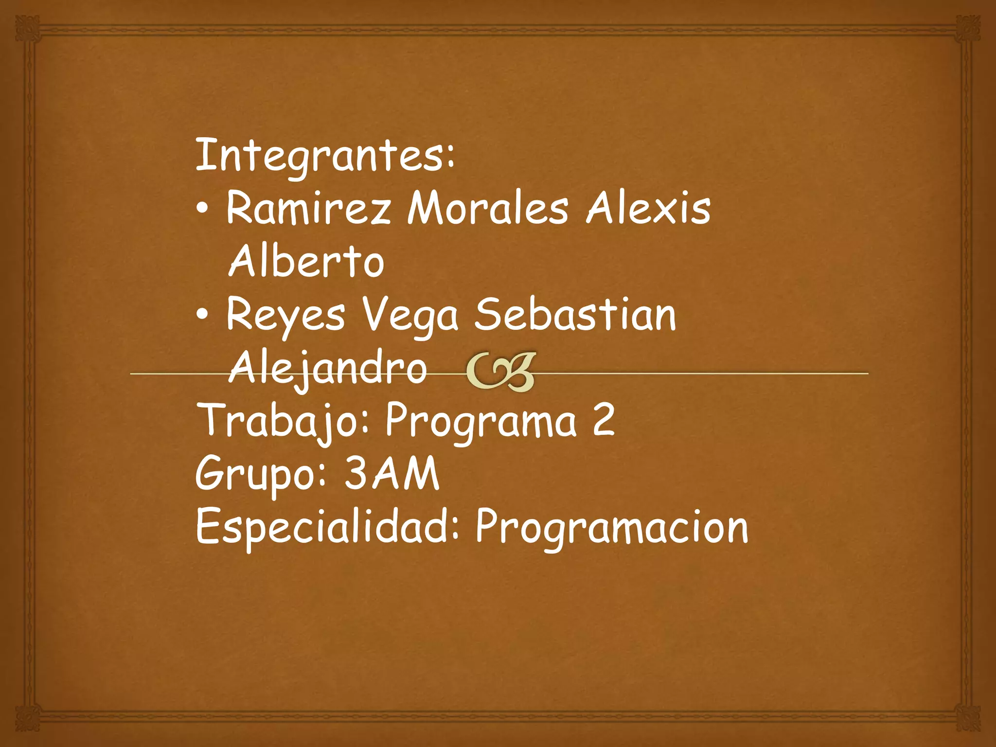 Este documento lista a dos integrantes de un grupo de programación, Ramirez Morales Alexis Alberto y Reyes Vega Sebastian Alejandro, que pertenecen al grupo 3AM y están trabajando en el Programa 2 para su especialidad en Programación.