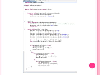 Este documento describe los pasos para crear un proyecto de aplicación Android en Eclipse, incluyendo darle un nombre al proyecto, seleccionar las opciones hasta finalizar y ver la interfaz gráfica del programa. Luego muestra cómo el programa puede sumar, restar o multiplicar dos números ingresados y ejecutar las operaciones seleccionadas. Finalmente, comenta que Eclipse es útil para crear emuladores y ejecutar aplicaciones en el celular de manera similar a una calculadora.