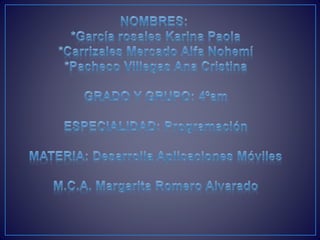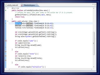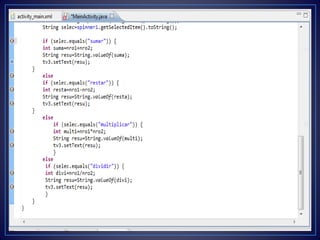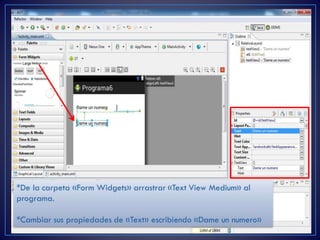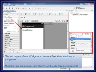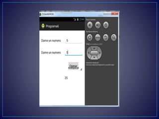Este documento proporciona instrucciones para crear una aplicación Android simple en Eclipse que permite a los usuarios ingresar dos números y seleccionar una operación matemática (suma, resta, multiplicación o división) para calcular el resultado, el cual se muestra en un texto. Las instrucciones guían al lector a través de la creación de un nuevo proyecto Android, agregar campos de texto, un botón y un texto para mostrar el resultado usando la interfaz de diseño de Eclipse.