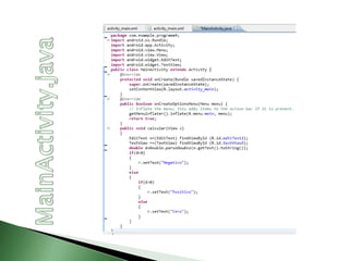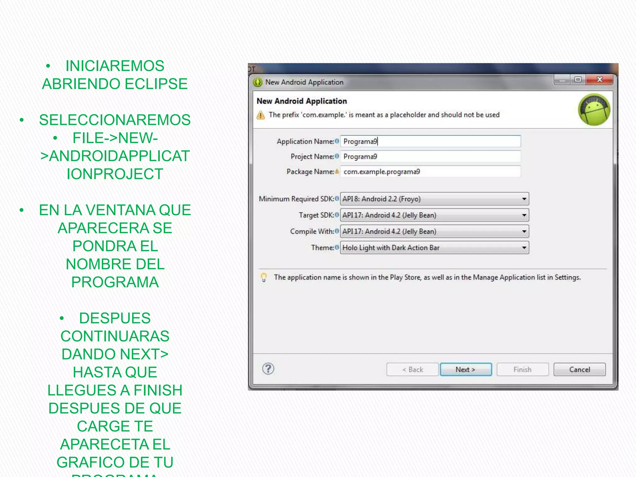 El documento describe los pasos para crear un proyecto de aplicación Android en Eclipse, incluyendo darle un nombre al proyecto y continuar hasta finalizarlo. Explica que después de cargar el proyecto aparecerá la interfaz gráfica con los widgets como TextView y Button.
