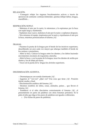 Este documento presenta un programa de intervención para la enseñanza del fonema /d/. Describe la articulación del fonema, incluyendo la posición de los labios, dientes y lengua. El programa tiene objetivos como vivenciar la articulación y automatizar el fonema. Incluye contenidos como relajación, discriminación auditiva y articulación a través de ejercicios que involucran la respiración, praxias y el reconocimiento de rasgos visuales, táctiles y propioceptivos.