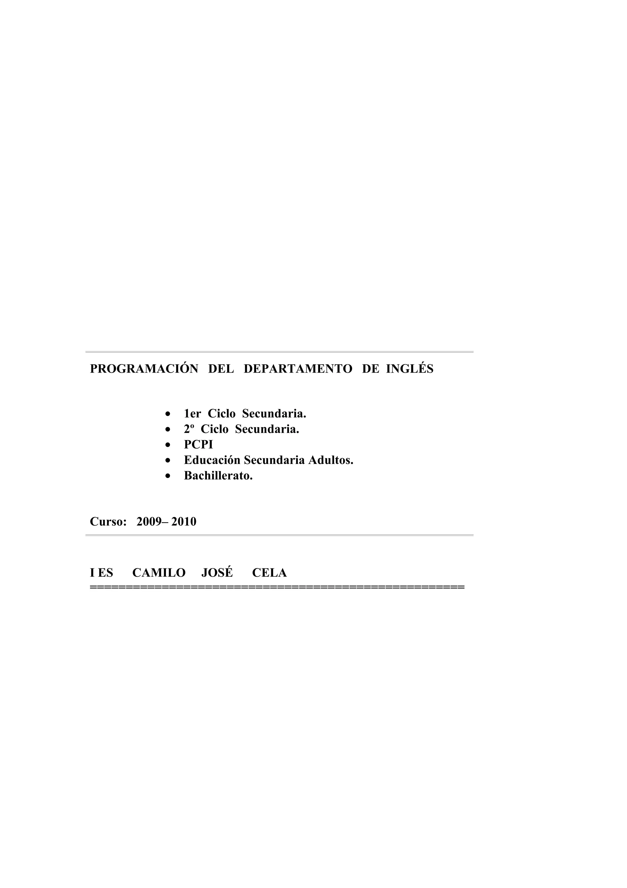 Este documento presenta la programación del departamento de inglés para el curso 2009-2010 en el Instituto Camilo José Cela. Incluye la composición del departamento, los grupos a los que imparten clase cada profesor, las actividades planificadas como excursiones y visitas, los libros de texto utilizados y las competencias que se desarrollan con especial énfasis en la competencia de comunicación lingüística.