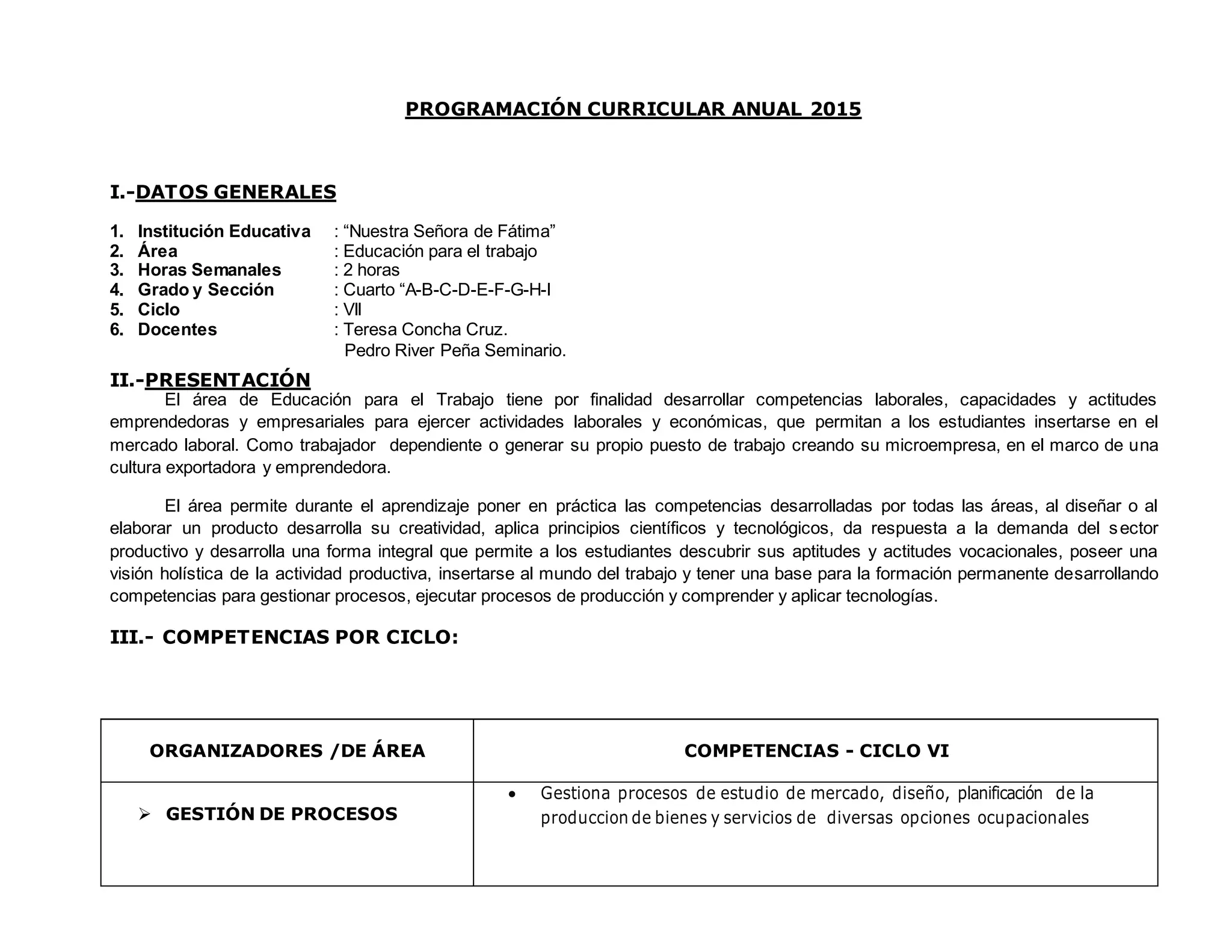 Este documento presenta el programa curricular anual 2015 para el área de Educación para el Trabajo en el grado cuarto de la Institución Educativa "Nuestra Señora de Fátima". El programa describe la información general, las competencias por ciclo, los problemas transversales y valores, las necesidades de aprendizaje, y la calendarización y organización de las unidades didácticas para el año. El objetivo del área es desarrollar competencias laborales y capacidades emprendedoras en los estudiantes.