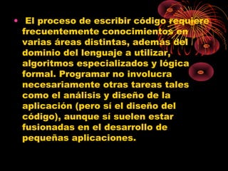 La programación es el proceso de diseñar y mantener código fuente en un lenguaje de programación para crear software que se comporte de manera específica. Los algoritmos son conjuntos de instrucciones ordenadas que permiten resolver problemas, a menudo representados mediante pseudocódigo y diagramas de flujo. Existen distintos tipos de lenguajes de programación, como C++, que facilitan la manipulación de objetos y la programación multiparadigma, y herramientas como Pseint que ayudan a los estudiantes a aprender conceptos de programación.