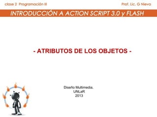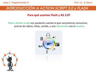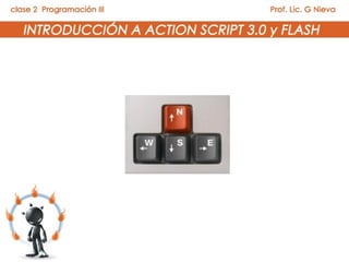 Este documento describe los conceptos básicos de Flash y ActionScript 3.0, incluyendo objetos, atributos, propiedades, métodos y eventos. Flash y ActionScript son útiles para comunicar información que requiere video, fotos, sonido e interacción con el usuario. Los objetos en ActionScript tienen propiedades, métodos y eventos que definen su comportamiento.