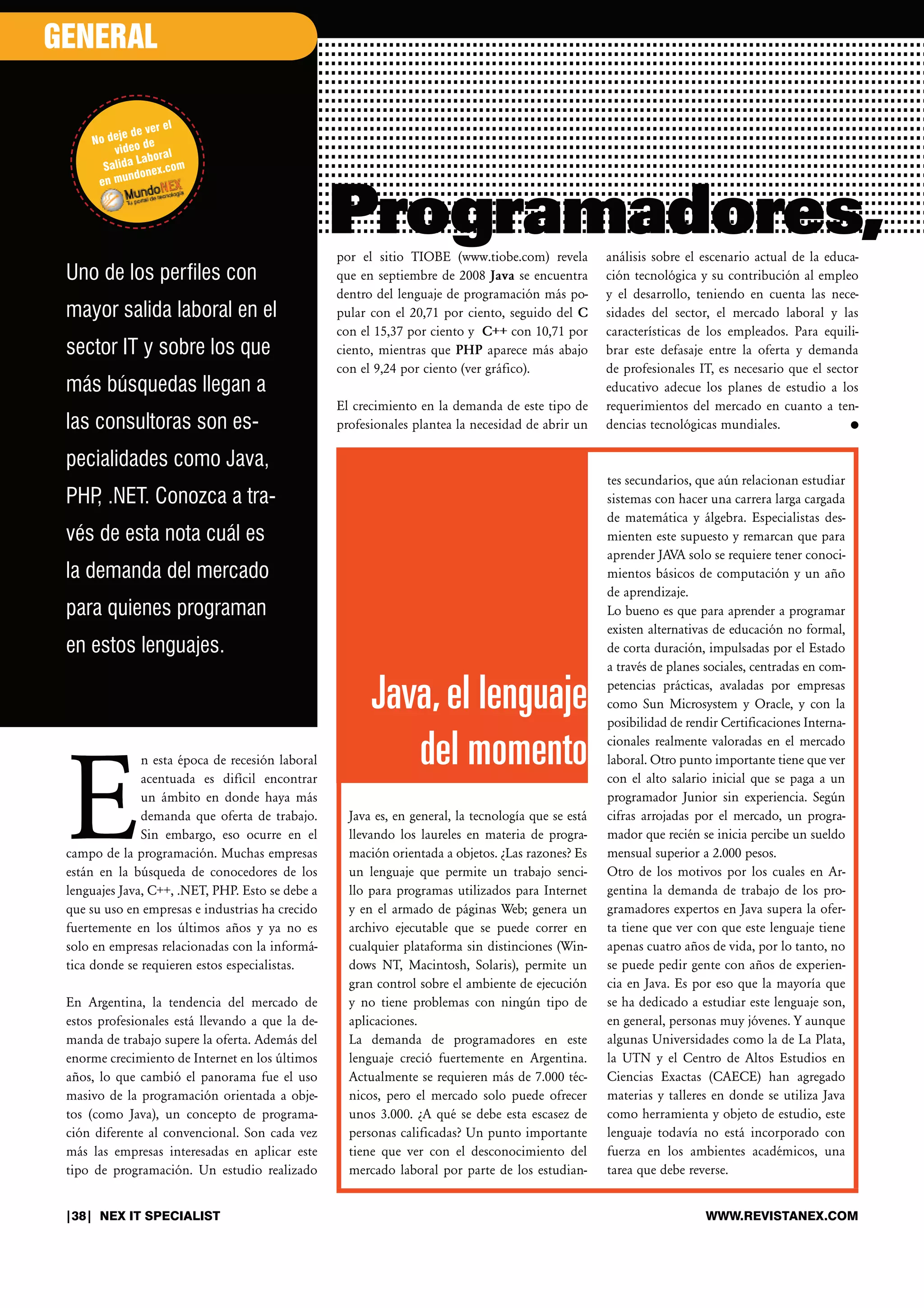 Java es actualmente el lenguaje de programación más popular, seguido de C y C++. Existe una alta demanda de programadores con experiencia en lenguajes como Java, PHP y .NET, ya que su uso ha crecido en empresas e industrias. Sin embargo, la oferta de programadores calificados en estos lenguajes no satisface la demanda del mercado laboral.