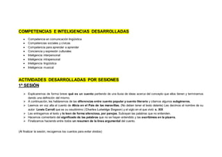 El documento presenta un miniproyecto sobre el texto narrativo del cuento. Explica que los estudiantes aprenderán sobre la estructura, tipos y partes de los cuentos tradicionales a través de la lectura y audición de cuentos. También desarrollarán habilidades como resumir cuentos, identificar elementos estructurales, y variar partes de los cuentos de manera creativa. El documento incluye los contenidos, criterios de evaluación, actividades por sesiones y competencias que se desarrollarán.