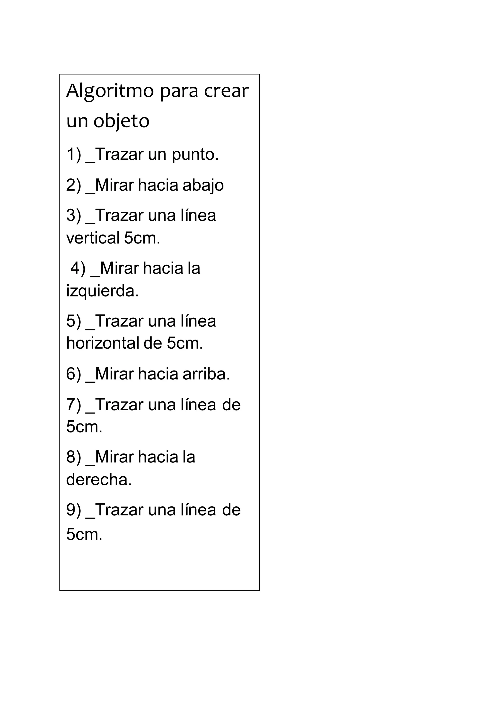 Este documento proporciona un algoritmo de 9 pasos para crear un objeto en forma de cuadrado de 5cm de lado trazando líneas siguiendo instrucciones de dirección.