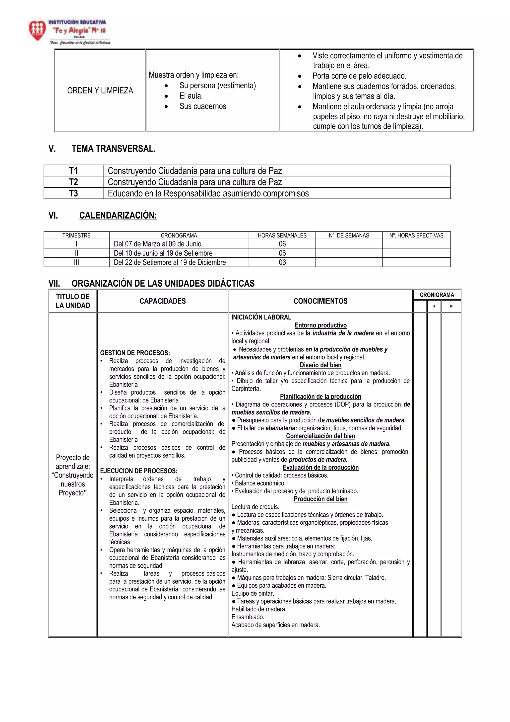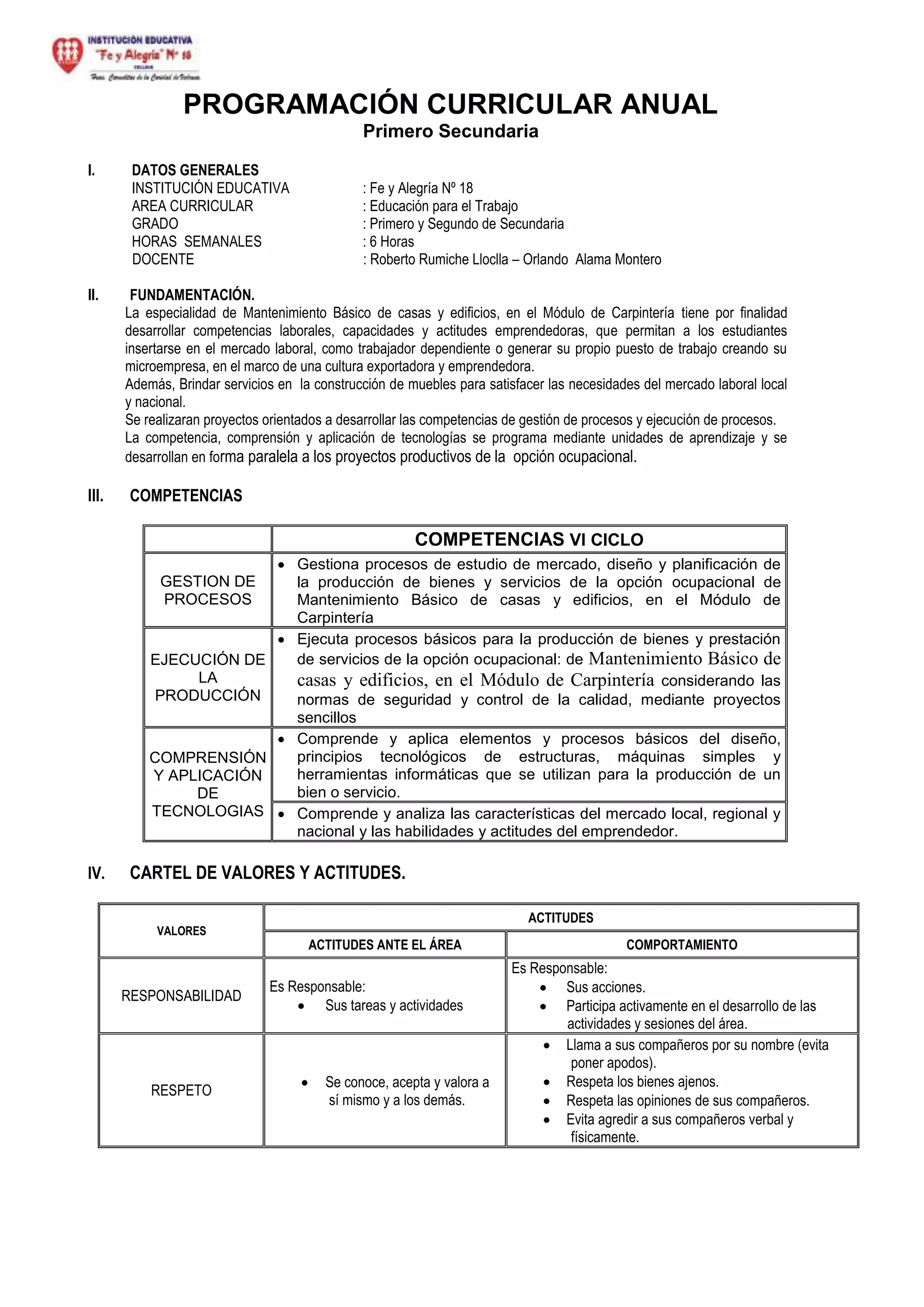 Este documento presenta el programa curricular anual para el primer y segundo año de secundaria en el área de Educación para el Trabajo. El programa se centra en desarrollar competencias laborales relacionadas con el mantenimiento básico de casas y edificios, en el módulo de carpintería. Incluye objetivos, competencias, unidades didácticas, cronograma y estrategias de enseñanza y evaluación.