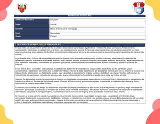 El documento describe la planificación anual del área de arte en una institución educativa, enfocándose en el desarrollo de competencias y habilidades de los estudiantes de primer año de secundaria en diversas manifestaciones artístico-culturales. Se resalta la importancia de experiencias creativas que fomenten el autoconocimiento, la comunicación efectiva, el respeto por la diversidad y el manejo crítico de la tecnología. Además, incluye una calendarización del año escolar y unidades de aprendizaje centradas en danza, teatro, música y artes visuales.