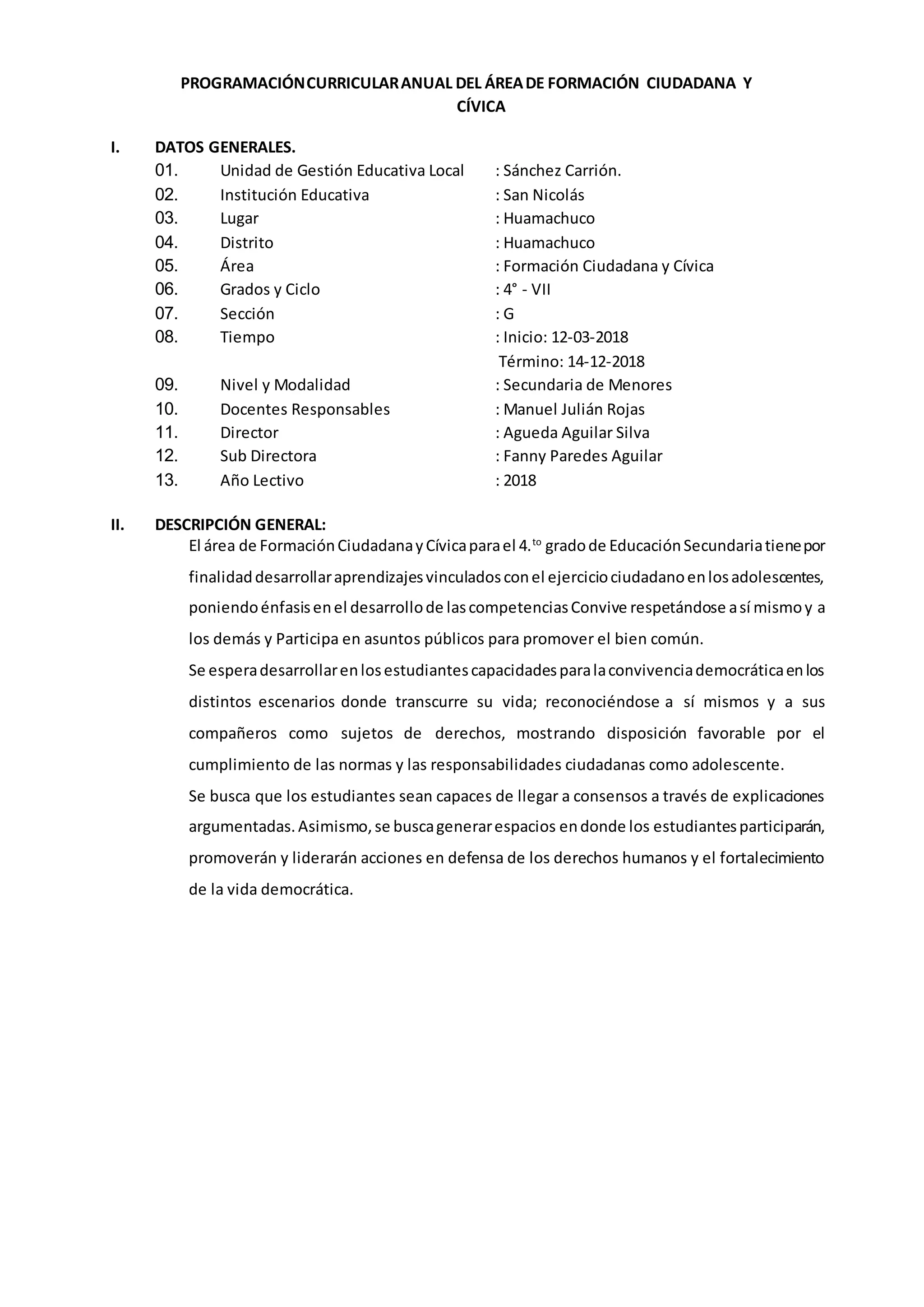 Este documento presenta el programa curricular anual del área de Formación Ciudadana y Cívica para el cuarto grado de educación secundaria en la Institución Educativa San Nicolás de Huamachuco para el año 2018. El programa se organiza en cuatro unidades didácticas que abordan temas como los hábitos de higiene, la identidad institucional, la disciplina y una cultura alimenticia saludable. Cada unidad incluye competencias, campos temáticos, productos esperados y una situación significativa relacionada a problemas observ